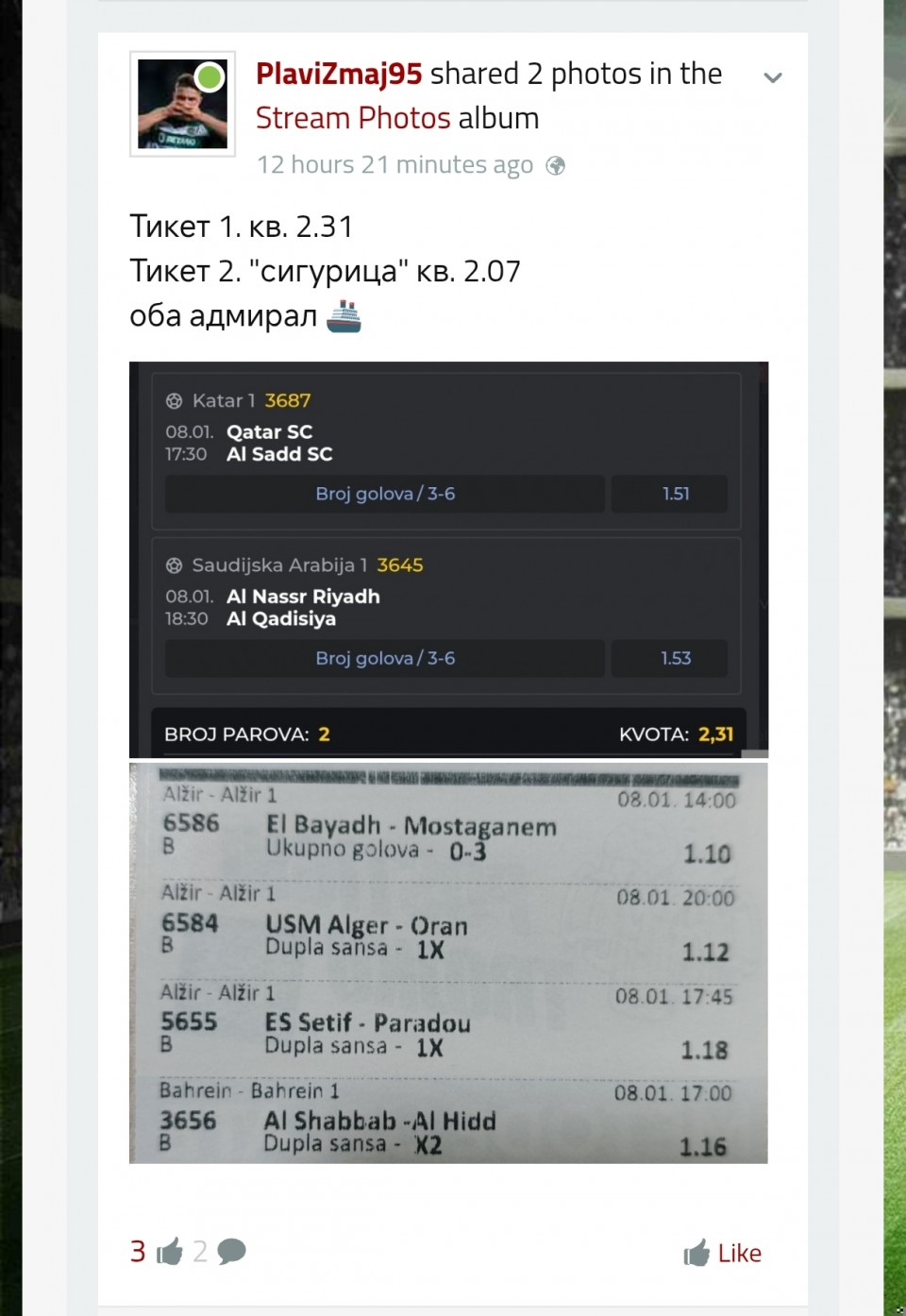 Probao na 1000 din da pratim. Pretpostavljam da Arsenal neće da izgubi ali će Liverpul da da gol. Isto tako očekujem da Milan povede 2:0, 3:0 pa da se opuste malo i prime jedan gol. Videćemo 🍀🍀🍀