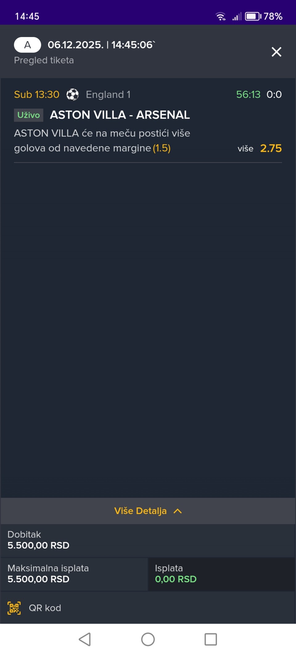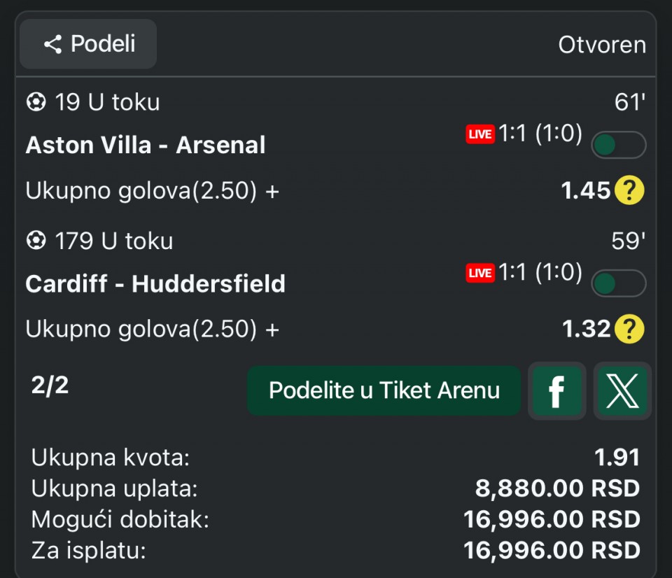 T.Brnovic ispod 4,5 gola koef 1,85