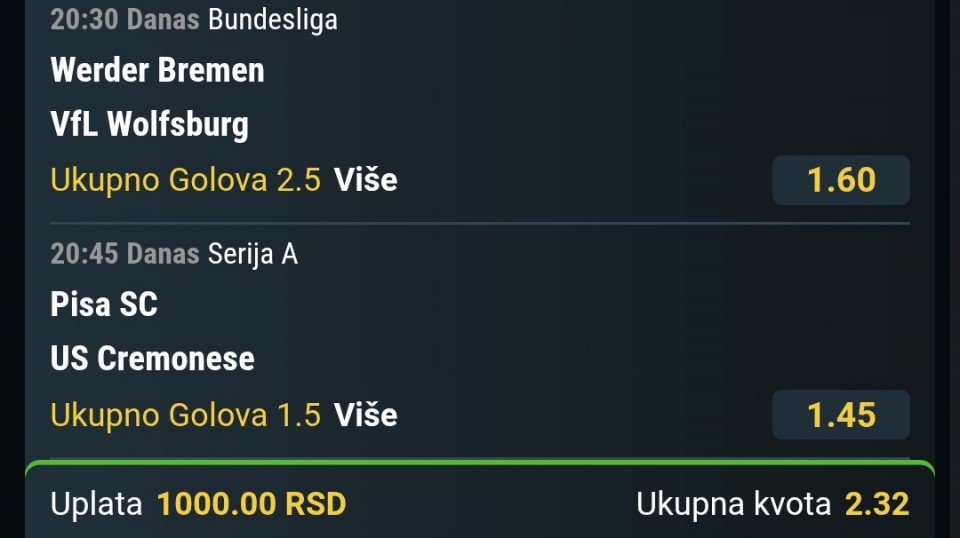 07.11.2025. 20:30h Spezia - Bari; tip: X; kvota: 3.15; uplata: 180,00 din.; isplata: 567,00 din.
