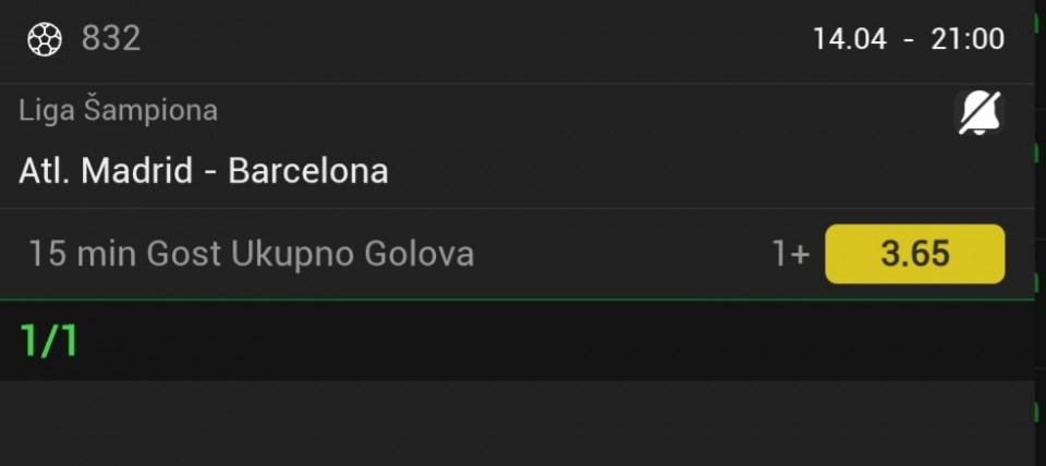 Ovo kada sam odigrao pre 5 dana, kvota je sutradan odmah otišla na 3.90 (jbg, da sam znao...), da bi od tada bila u slobodnom padu svaki dan i trenutno je na neverovatnih 3.05 u superbetu sa tendencijom daljeg pada (kod ostalih verujem da može da se nađe po ovoj kvoti). Kao i za prvu utakmicu kada sam imao osećaj za Atletiko, tako sada imam i za Barselonu. Za Barselonu se zna kako će da igra, ali ovaj tip sam nakon prospavane noći odigrao i zbog Atletika kako je odigrao tu utakmicu. Iako jeste postigao 2 gola kako sam predvideo, onako odigrati sa igračem više je bilo blago rečeno kukavički. Meni su oni delovali u nekim trenucima uplašeno kada su imali loptu, nisu znali šta će sa njom, da bi iz jednog bezazlenog centaršuta postigli gol - eto koliko lako su došli do gola - samo da su hteli tako da nastave i reše posao već u tom susretu. Ovako se verovatno očekuje autobus pred golom i nada da će odbrana da izdrži napade u vidu cunamija Barselone...