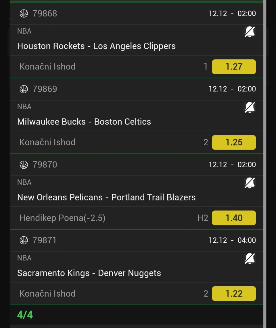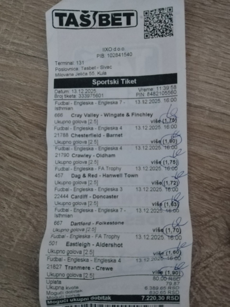 13.12.2025. 21:00h Dep. La Coruna - Real...12.12.2025. 20:00h Den Bosch - Venlo; tip: X; kvota: 3.65; uplata: 5.760,00 din.; isplata: 21.024,00 din.