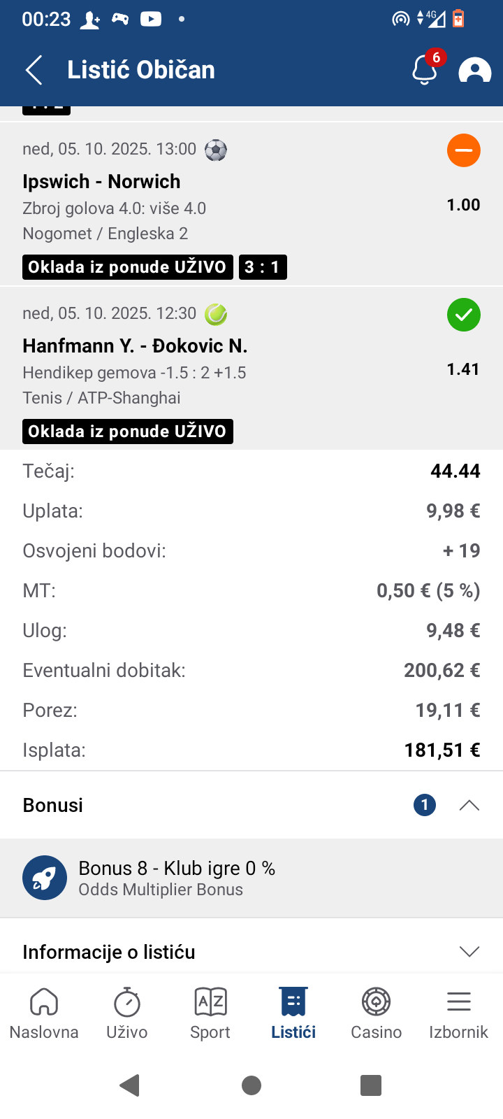 I samo da napomenem, za igrače iz hrvatske, koji igraju bonus 5 ili 8, u PSK kladionici, jeli netko imo SLIČAN SLUČAJ... Meni danas gospoda poništili bonus 8, jer su Ipswich- Norwich igrali 3-1,i kvota mi spala na 1.... Dobitak mi bio oko 4 glave, sa...I samo da napomenem, za igrače iz hrvatske, koji igraju bonus 5 ili 8, u PSK kladionici, jeli netko imo SLIČAN SLUČAJ... Meni danas gospoda poništili bonus 8, jer su Ipswich- Norwich igrali 3-1,i kvota mi spala na 1.... Dobitak mi bio oko 4 glave, sa tom kvotom 1, pao na 270, da bi mi na kraju isplatili samo 180 evra.... Neviđen lopovluk Show more