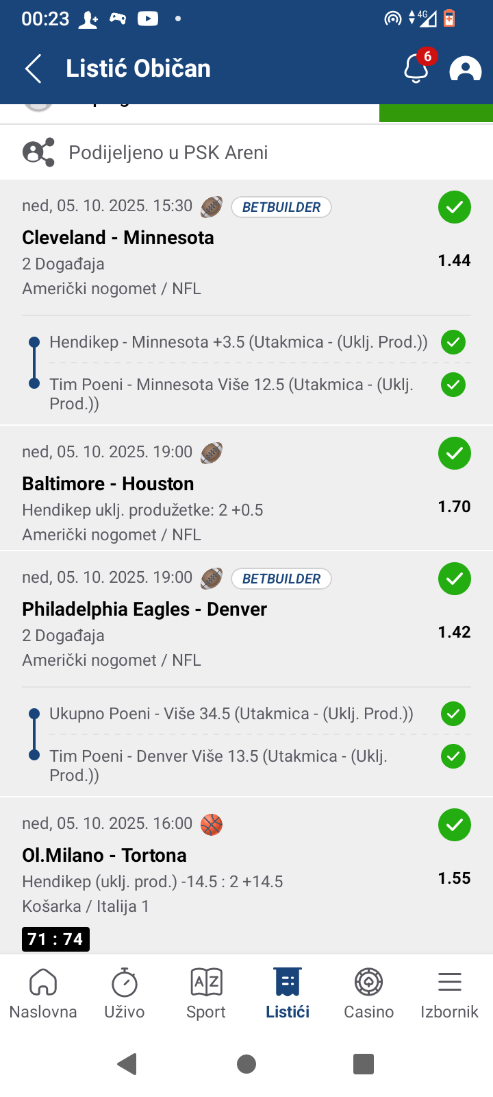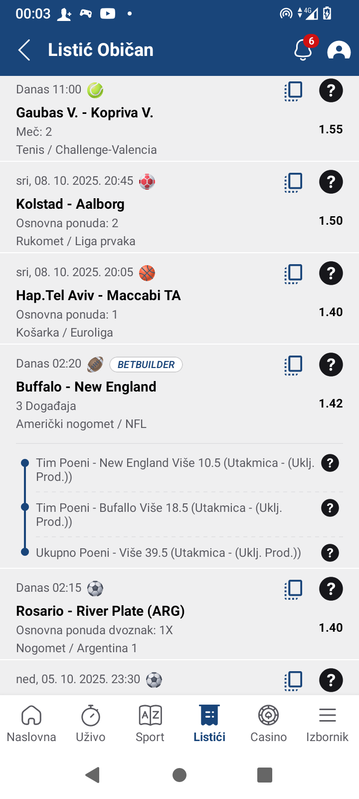 Predlog za večeras, Utorak i Sredu.... Gaubas - Kopriva 2, Gaubas hrpu mečeva u zadnje vreme odigro, danas je igro finale protiv Mikruta, i izgubio.. verujem da neće sutra igrat, kao što piše na tiketu, već u Utorak, a nebi mi bilo čudno, ni da...Predlog za večeras, Utorak i Sredu.... Gaubas - Kopriva 2, Gaubas hrpu mečeva u zadnje vreme odigro, danas je igro finale protiv Mikruta, i izgubio.. verujem da neće sutra igrat, kao što piše na tiketu, već u Utorak, a nebi mi bilo čudno, ni da odustane, jer ima 2 turnirska finala u nizu... Svakako, lepa kvota na iskusnog Koprivu///////. NFL, Bufalo - New England, bet bilder, više od 39.5 poena, Buffalo više od 18.5 poena, i New England više od 10.5 poena... U obe ekipe, sve napadačke opciju su dostupne za večerašnji meč, nema ozljeda u napadu/////// Hapoel - Maccabi 1 ko vrata... Hapoel je brutalan,20 razlike protiv Barce, i 7 protiv Efesa... Maccabi, ništa posebno, izgubio od Parisa, koji ima mnogo slabiji roster, nego lani... Taj isti Paris, je izgubio od Le Mansa, u polufinalu francuskog kupa//////// Kolstad - Aalborg 2, poklon kvota na Dance... Tuku Vezsprema, tuku Sportinga, a taj isti Sporting, u polufinalu Ibiza kupa, igra nerešeno protiv Barcelone u finalu///// Rosario - River plate 1x, da se ispoštuje legenda Di Maria, uostalom, River Plate, je ovaj tjedan igro uzvrat Argentinskog kupa//////Uživo, Bahia - Flamengo, Flamengo više od 5.5 šuteva prema golu Show more
