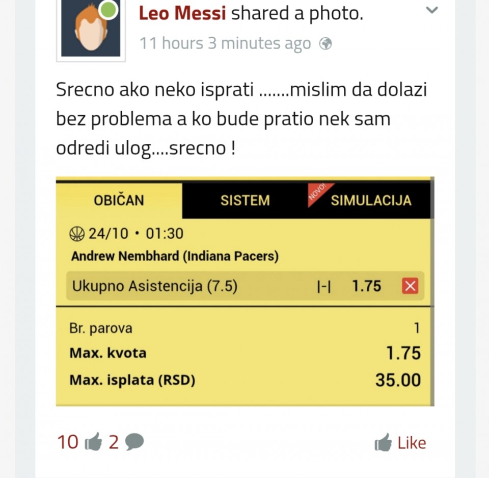jednostavno ovo ne znam kako da padne, nakon ove prve tekme spursa drugi scenarij osim ovog mi nema smisla, pelikani klasicno losi cak su i vodili nad grizlijima ali ocekivano izgubili, jedino je malo lose je sama kofa na wembija jer je izdominirao prvu tekmu i sad mu je grana bas visoka al u ovoj kombinaciji mi je sasvim okej, sretno