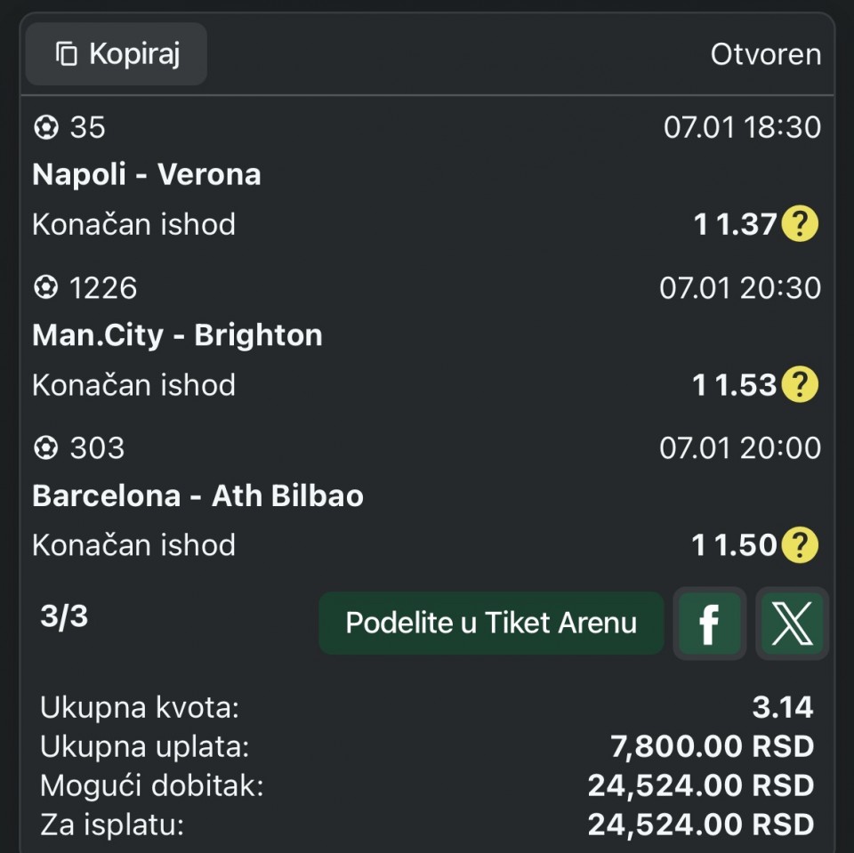 Probao na 1000 din da pratim. Pretpostavljam da Arsenal neće da izgubi ali će Liverpul da da gol. Isto tako očekujem da Milan povede 2:0, 3:0 pa da se opuste malo i prime jedan gol. Videćemo 🍀🍀🍀