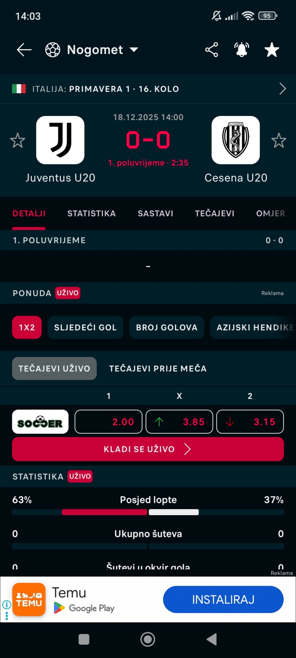 tip: over 3.5 (72 minut trenutni rezultat 1:2)