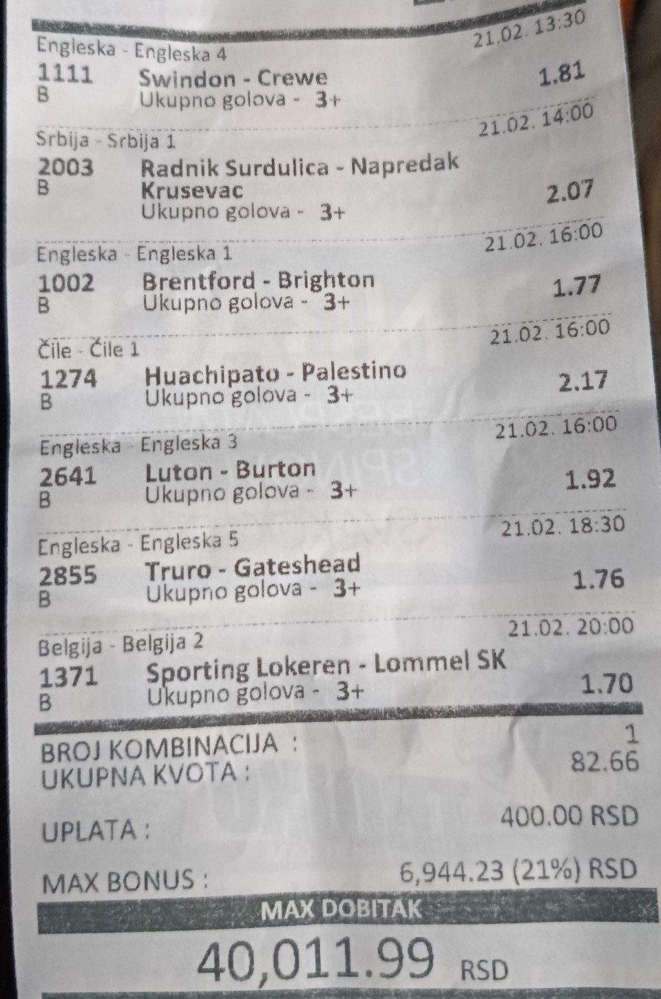21.02...danas jurim dva dubla sve su prvi koraci tj. početna uplata, na "Full Time Result" dublu pravim pauzu, nemam ni jedan siguran fiks, igram na golove danas, pa sve dok ne pozeleni, oprezno sa ulozima, rasporedite ih dobro, srećno