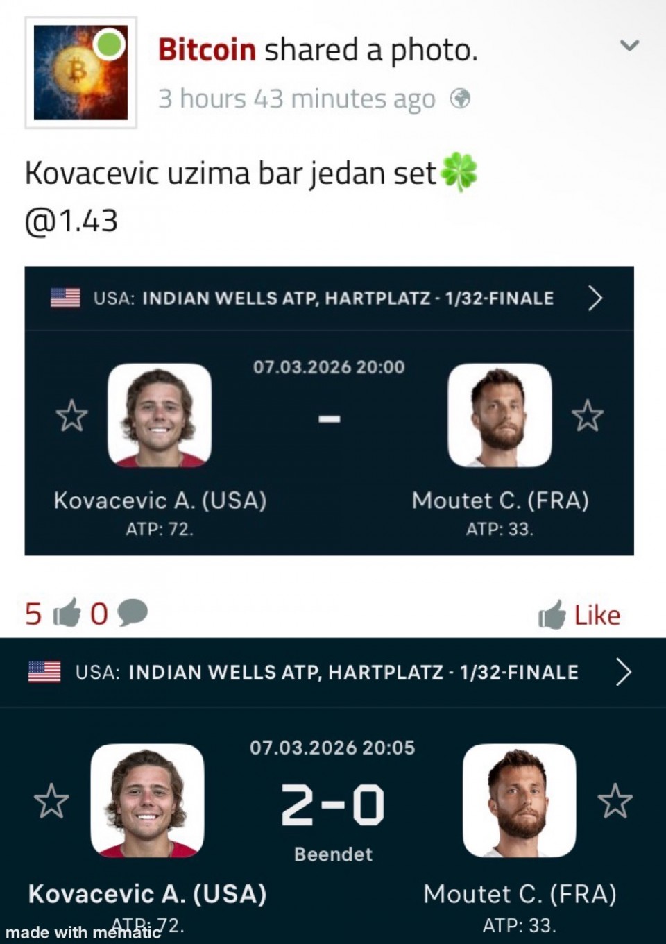 08.03.2026. 21:00h Dep. La Coruna - Granada; tip: X; kvota: 3.40; uplata: 1.440,00 din.; isplata: 4.896,00 din.