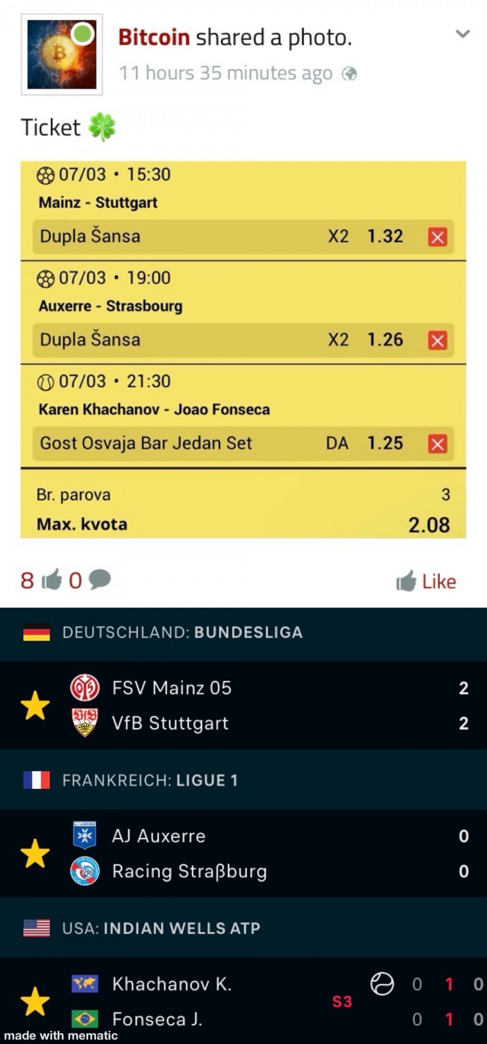 Nije me bilo duze vrijeme a posto cu veceras probati sastaviti nesto podijelit cu i ovdje sa vama. Ukupna kvota je 6.33.