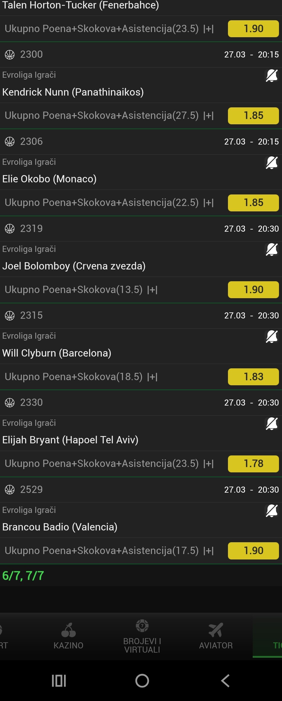 Danas dosta jaka ponuda, ovo je sigurno previse parova ali kacim da bi videli sta mi se sve svidja.. igram i jos nesto pored ali ovo je osnovica.. sa Czv mi se dosta svidjaju ponuda trojki, tipa Sengelia 0.5+ @1.62, Odzelej 0.5+ @1.90, Punter 1.5+...Danas dosta jaka ponuda, ovo je sigurno previse parova ali kacim da bi videli sta mi se sve svidja.. igram i jos nesto pored ali ovo je osnovica.. sa Czv mi se dosta svidjaju ponuda trojki, tipa Sengelia 0.5+ @1.62, Odzelej 0.5+ @1.90, Punter 1.5+ @1.55, Kalina 0.5+ @1.50.. uzmite sta Vam se svidja, na tiketu ocekujem barem 5/7 😁 Show more