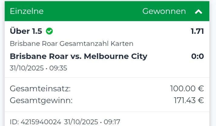 Brisbane Roar 1.5 + kartona 🟨 1.71 kvota.