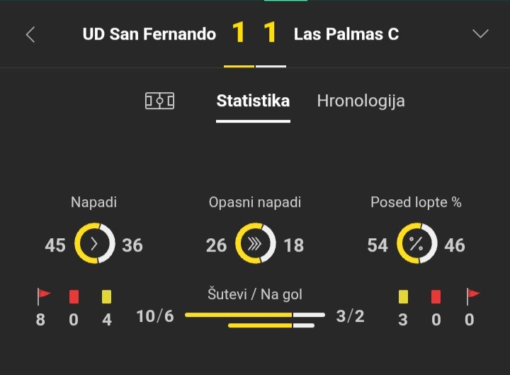 Ludih prvih 45min San Fernando je imao 1.36 kvotu na pobjedu prije pocetka i prima rani gol zatim vrse ofanzivu 8 kornera 7 zutih i postize u 45+ gol za 1-1. Pada ovdje crveni u drugom...LIVE Tercera Division