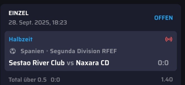 Sestao 6:2 gol razlika nakon 3 kola dok Naxara na zadnjem mjestu 3:7 bez pobjede i gola u gostima. Sad da ce bas zablokirat prvih 45min ipak je i kod jednih i drugih nakon prva 3 kola padao po 1 gol u pp idemo i 4 zaredom!!