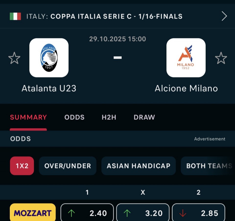 🇮🇹 Atalanta u23 - Alcione Milano 3+ (2.05), 4+ (3.75)