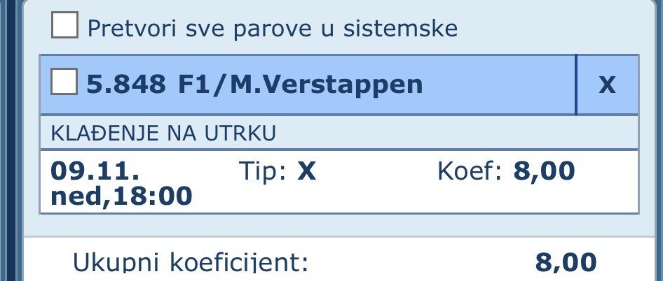 Zavrsnica Formule 1 ove sezone donosi spektakl u Interlagosu. Max Verstappen je jucer ispao u prvom krugu kvalifikacija, prvi put bez da je razlog bio udes ili nesto slicno. Bio je 16. od ukupno 20 vozaca na kvalifikacijama, po mom misljenju najveci razlog je bila drasticna promjena konfiguracije bolida neposredno prije trke, od poda bolida pa do zadnjeg krila su sve promjenili. Pojavila se informacija jutros da ce cijelu konfiguraciju vratiti na onu prije Meksika koja se pokazala itekako ucinkovitom. Upravo zbog toga ce Verstappen morati zapoceti trku iz Pit boxa. Prosle godine je sa 17. pozicije uspio pobjediti trku, ko zeli probati moze se kladiti i direkt na pobjedu kv. je oko 33. Uz malo sreće (u ovom slučaju kiše) sam uvjeren da moze doci do top 3 pozicija, Ja cu po ovoj kvoti odigrati na 20€ pa kud puklo da puklo