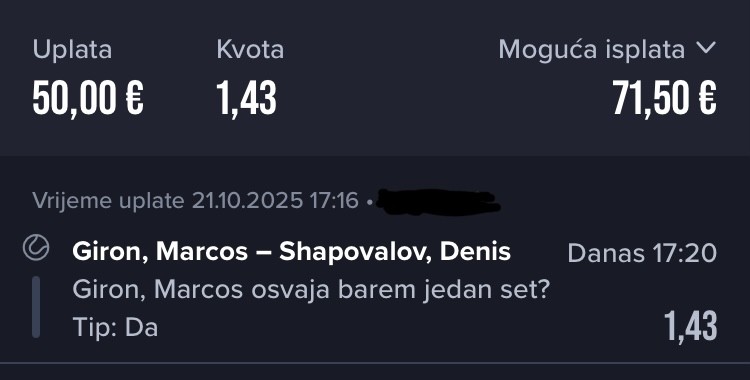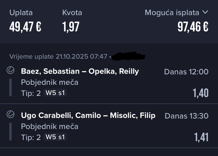 Pokušava Medo da se spasi preko jakih turnira, ali sve je to loše. Prije nekoliko dana Rinderknech mu održao lekciju tenisa. Onda famozni Tien koji ga muči kao da je Sinner. Pitanje je koliko mu znači ovaj nižerazredni turnir. Walton pokazao zube protiv top tenisera. Pošteno namučio Alcaraza, Zvereva i Medvedeva, kojeg je dobio u augustu 2:1. Nadam se jakom otporu Waltona.