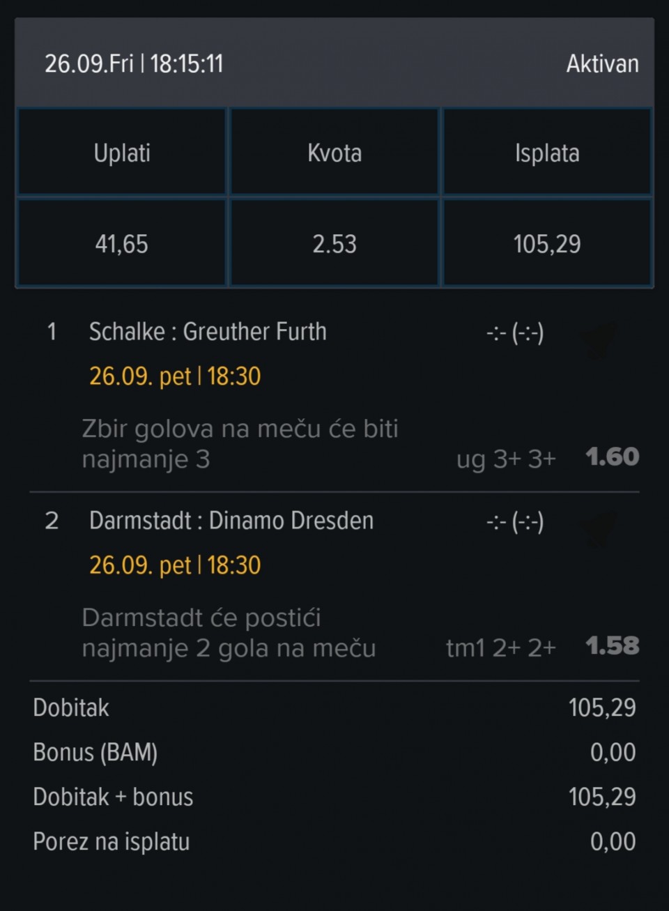 Srecno svima, idemo po dobitne. Statistiku cu voditi cijelu sezonu sto se tice singlova. Za sad je to 2/3 👍🏻🍺🎩