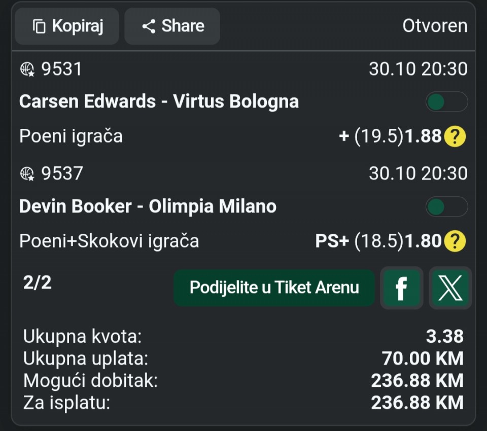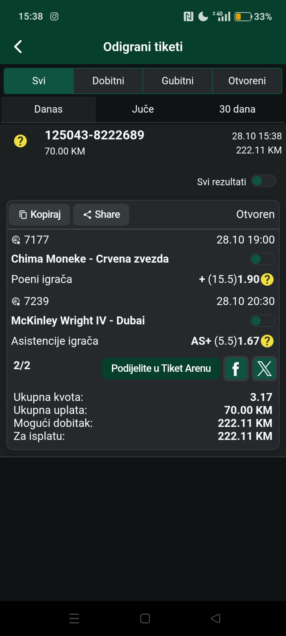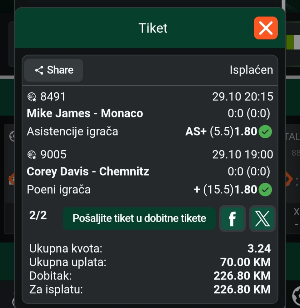Nadam se da ste pratili i danas i lijepo zaradili, nije lose ovako mogao bi se covjek naviknuti, cujemo se za NBA nesto poslije, a sutra standardno EL. 👍🏻