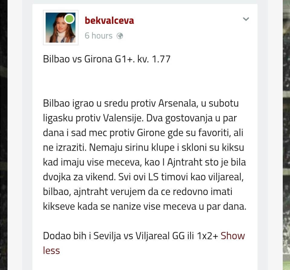 Bilbao igrao u sredu protiv Arsenala, u subotu ligasku protiv Valensije. Dva gostovanja u par dana i sad mec protiv Girone gde su favoriti, ali ne izraziti. Nemaju sirinu klupe i skloni su kiksu kad imaju vise meceva, kao I Ajntraht sto je bila dvojka za vikend. Svi ovi LS timovi kao viljareal, bilbao, ajntraht verujem da ce redovno imati kikseve kada se nanize vise meceva u par dana.