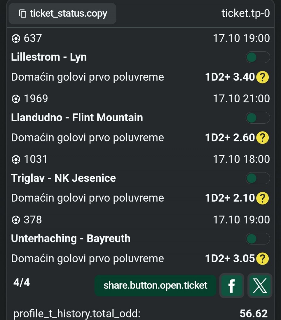 Ovaj Singl dana samo kontru treba igrat Oulu 2...Zamoliću Admine il tako reć Administratore glave ove stranice znam da imate korist od sponzorstva ove kladionice al brate non stop poruke da se Registruje na istu, hoću ako će mi ona platiti Alimentaciju