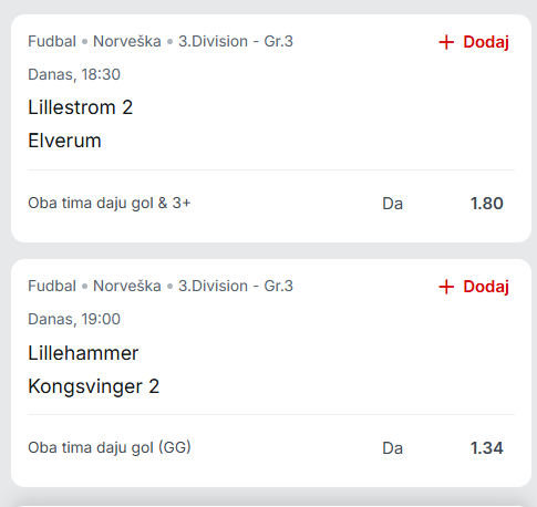 *Lillestrom2-Elverum, na prosle dve tekme 5:1 i 3:3, msm da je odlicna kvota za gg3+.
