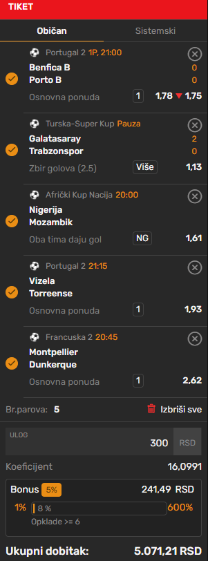 Evo jedan tiket od mene za danas, 5 utakmica kvota je oko 15.