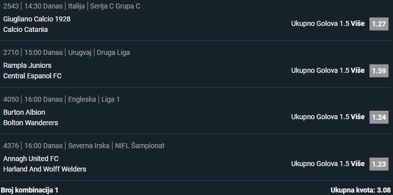 'Piramida' u testiranju preživela. Današnji predlozi u prilog slici. U slučaju promašaja dupliram ulog na sledeću (ili malo više od duplo, u zavisnosti od kvote...). U slučaju pogotka, reset na početni ulog. Ulozi simbolični, ipak je u pitanju...'Piramida' u testiranju preživela. Današnji predlozi u prilog slici. U slučaju promašaja dupliram ulog na sledeću (ili malo više od duplo, u zavisnosti od kvote...). U slučaju pogotka, reset na početni ulog. Ulozi simbolični, ipak je u pitanju maraton a ne sprint. Pamet u glavu i bez zaletanja! Bistro! Show more