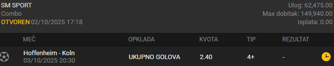 Na 3 od zadnje 4 utakmice Kelna dolazi ovaj tip. Došla bi i prošla (3 gola) da se nisu ispromašivali - 30 šuteva i jedno 4-5 promašenih zicera. Hofenhajm je još bolji što se tiče proseka, a pogotovo kada igra na svojoj ProZero areni jer su nastavili tamo gde su stali prošle sezone - na dve utakmice ove sezone je palo ukupno 9 golova. I njihovi H2H dueli obiluju golovima, i opet mnogo ih je više na ovom stadionu - 5 od poslednjih 7 se završilo sa minimum 4 gola...