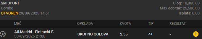Atletiku će moral biti na najvišem nivou nakon pobede protiv Reala, dok Ajntraht od početka sezone igra za navijače, i mislim da tajming za njihov susret što se tiče golova nije mogao biti bolji. Tako da se stvarno mislim da će i ovde biti pregršt šuteva i velikih šansi, ali za razliku od prošlonedeljnog pada, da će ovog puta kvalitet šuteva biti na totalno drugačijem nivou i opravdati ovaj nivo takmičenja...