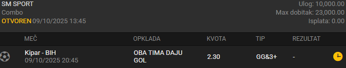 Protivnik je direktan konkurent i očekujem jednu zaista dobru utakmicu. Unazad 10 godina su odigrali 5 H2H utakmica i čak 4 su se završavale ovim tipom, a pogotovo su bile efikasne utakmice na Kipru kao što je i sada slučaj. I u prvom meču ovih kvalifikacija je došao ovaj tip, a Kipar je bio sve samo ne u podređenom položaju, tako da ih večeras očekujem u još boljem izdanju. Ali kako će morati da napadaju, isto tako očekujem i da ostave dosta prostora u odbrani, a iskusni Džeko pre svih će to već uspeti da iskoristi jer im je odbrana i ovako očajna - na poslednjih 7 susreta samo jednom su uspeli da sačuvaju svoju mrežu i to protiv San Marina...