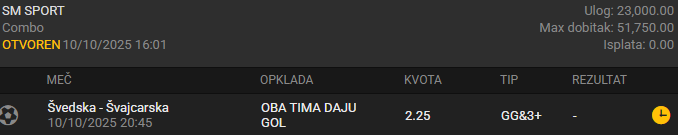Švajcarska je u neverovatnoj seriji dobrih rezultata i igara. U Solni će pokušati da dođe do šeste uzastopne pobede (nakon 8 utakmica bez pobede) i time sebe još više približi šestom uzastopnom SP. Ne znam štaim se desilo sa napadom, ali na poslednjih 5 utakmica ne postižu ispod 3 gola. Takođe su uspeli i da sačuvaju svoju mrežu na poslednje 3 utakmice, ali teško da rezervni tim USA, Kosovo i Slovenija na svom terenu, mogu da se porede sa Šveđanima na njihovom gde ipak očekujem da kapituliraju, možda i nekoliko puta...