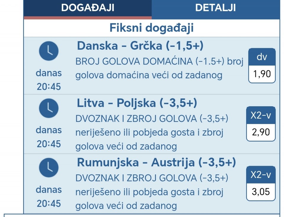Moj tiket za večeras... Danci su bolji za 2 gola, Poljaci takodje a Litva će im vjerovatno dati gol. Rumunima večeras odgovara samo pobjeda i bit će golova sigurno.