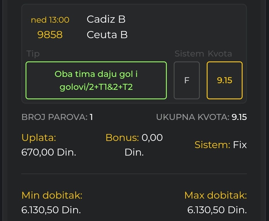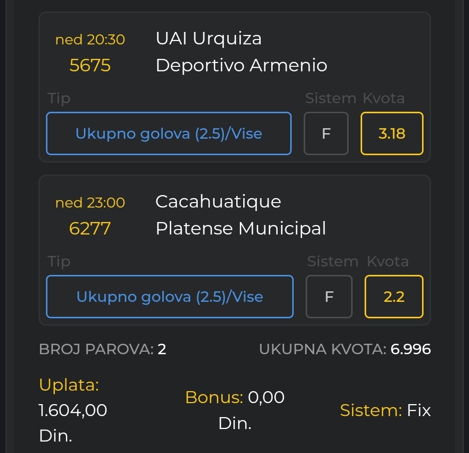 21.00h. Tigre - Bogota GG2+ (6,65)...20.30h. Pontedera - Pezaro 3+ (2,07)