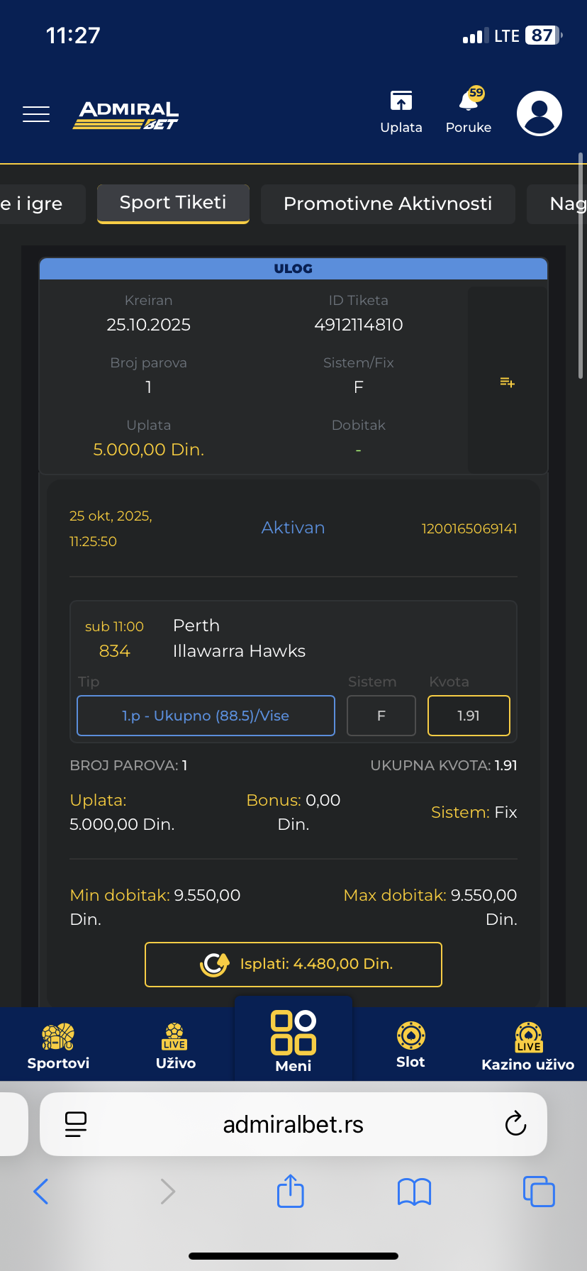 Pozdrav drugari, dugo sam na sajtu, ali nikad nisam kačio predloge. Evo moj tiket za danas za RG. Srecno!